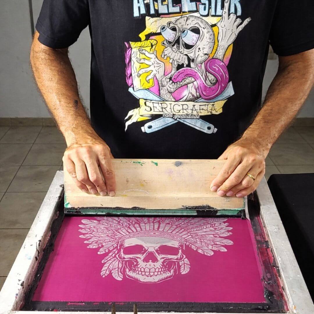 O silk screen é uma das técnicas mais tradicionais e resistentes da estamparia. Consiste na aplicação da tinta diretamente no tecido através de telas gravadas, garantindo padronização, cores sólidas e extrema durabilidade.